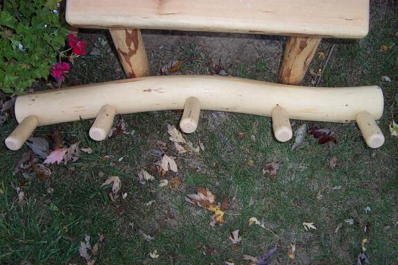 | The Full Log Wall Rack brings function and style together. This hand-peeled log rack features 5 sturdy log pegs perfect for coats or hats. (Pictured here with custom logs. Custom curvy logs are $25 extra.) Standard wall rack is straight. The rack is designed to screw to your wall through two pre-drilled holes. Hardware and wood plugs are included. A clear polyurethane finish brings out the natural beauty of the wood. Due to the rustic nature of log furniture, all dimensions are approximate. |