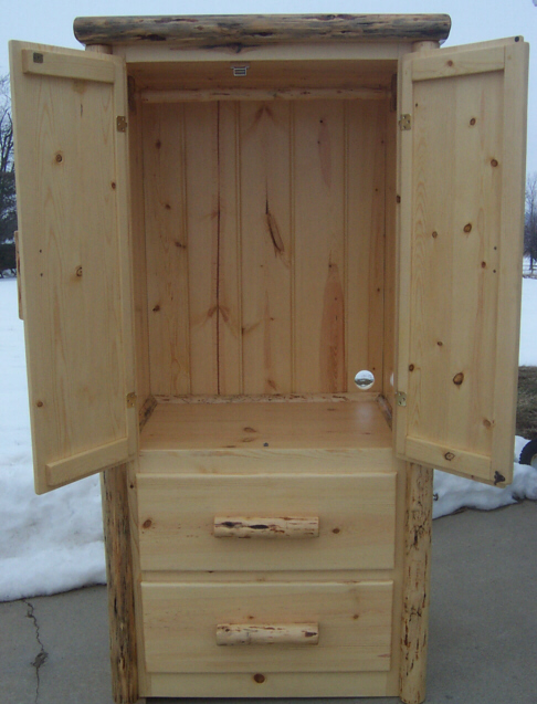 | The Grizzly Armoire is amazingly versatile. Use it in the bedroom as a beautiful armoire with dowel rod for clothing, or put your television inside for a wonderful entertainment center that looks great in the bedroom or living room. You may also choose to use it as a hutch in the dining room. The Grizzly Armoire features solid pine doors and euro-glide drawers. The standard Armoire comes with solid Pine Front drawers with log pulls. Upgrade with your choice of drawer style: Log Fronts or Half-Log Drawers that are notched on the bottom, or Log Slab or Half-Log Drawers with a Log Pull. See 4-Drawer Chest for all drawer style images. Choose to add "Footprints" to your chest for added style & beauty. (Footprints = Attractive log trim at floor.) Removable dowel rod is included. Due to the rustic nature of log furniture, all dimensions are approximate. |