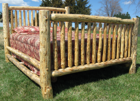 | The beautiful Madison Bed mirrors the charm of the outdoors with its intricate design. The queen size bed features 15 handpeeled spindles, individually crafted into place. NOW you can choose the Footboard Height: 40-inch posts or 30-inch posts. Mortise and tenon joints provide maximum strength and beauty. The King size has 2 extra spindles in the head-/footboards and extra boxspring supports. Due to the rustic nature of log furniture, all dimensions are approximate. |