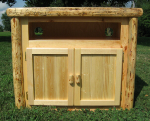 | Our TV Stand features plenty of hidden storage and a beautiful pine top for small to widescreen televisions. The Entertainment Center (not pictured) features a beautiful large solid pine top with log edging and a shelf for VCR, DVD or cable receiver. It has log front doors on the bottom with a shelf for storage. The TV area is 28w 23.5d 29.5h. Call for custom entertainment center price quote. We're happy to make an item to your specifications. Due to the rustic nature of log furniture, all dimensions are approximate. |